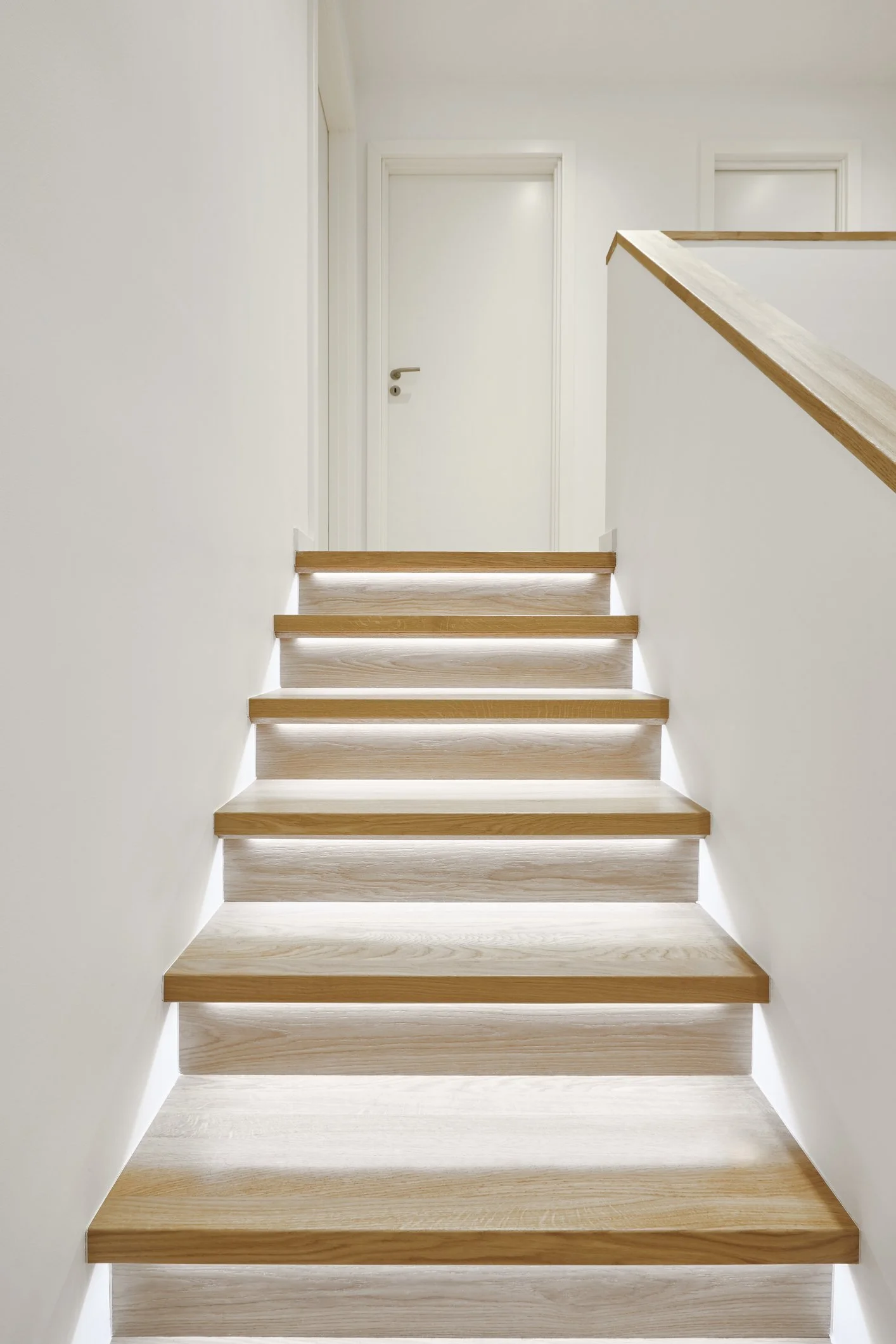 While browsing, take note that many LED tape and rope products are also dimmable. Consider this additional level of control for your installation. Illuminating stairs at the highest light level while in use provides greater safety. Reducing the light level using a compatible dimmer can help to achieve a softer look while still enhancing with some light. If you’ve got open-tread or floating stairs, shadows cast from the staircase lighting create additional visual interest.